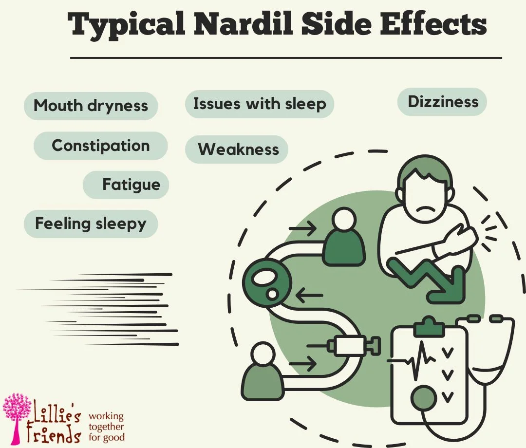 Nardil has adverse effects much like any other medication. After determining that the advantages of phenelzine exceed the hazards, a doctor will often prescribe it. Among the typical adverse consequences are:
